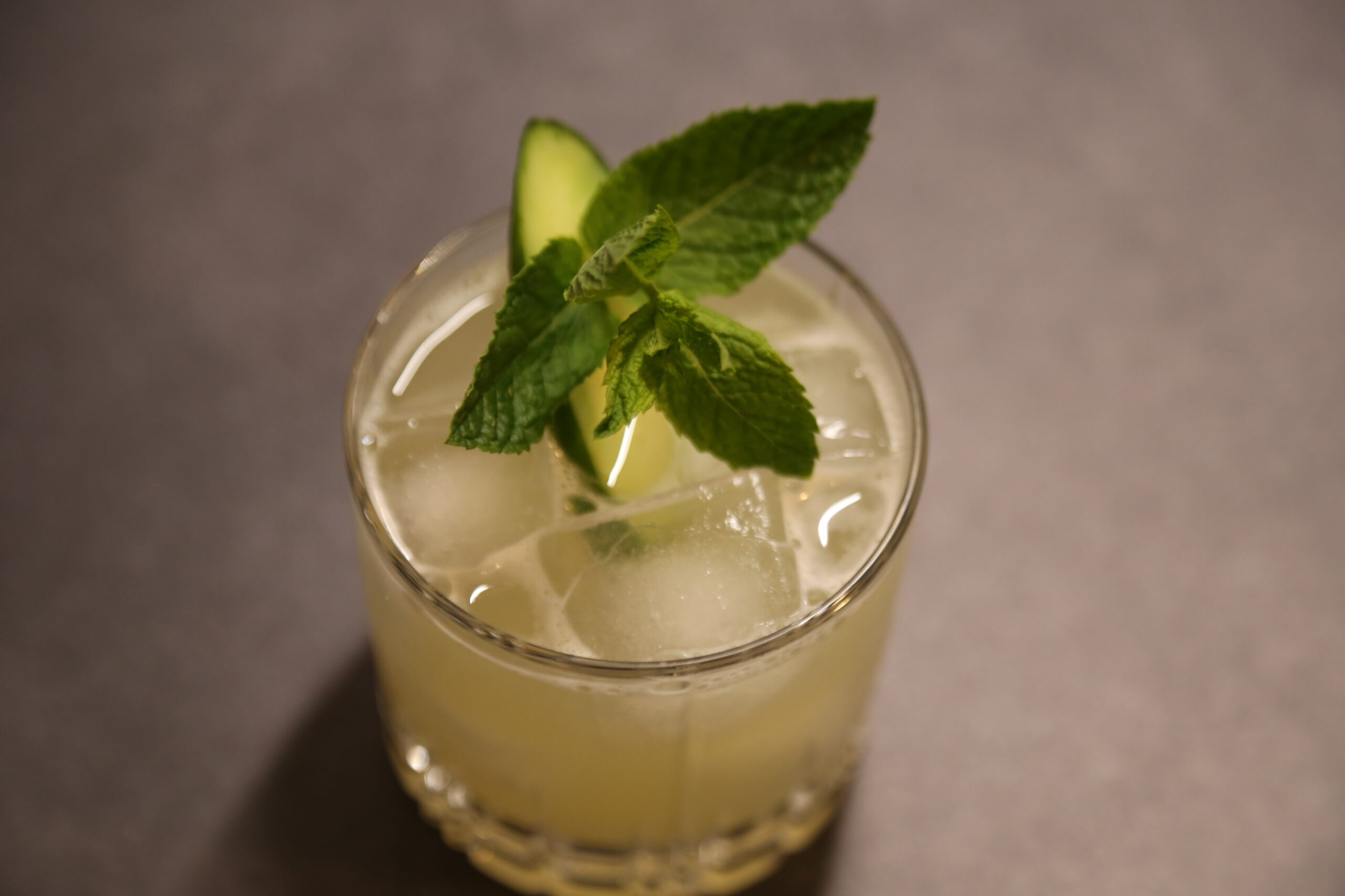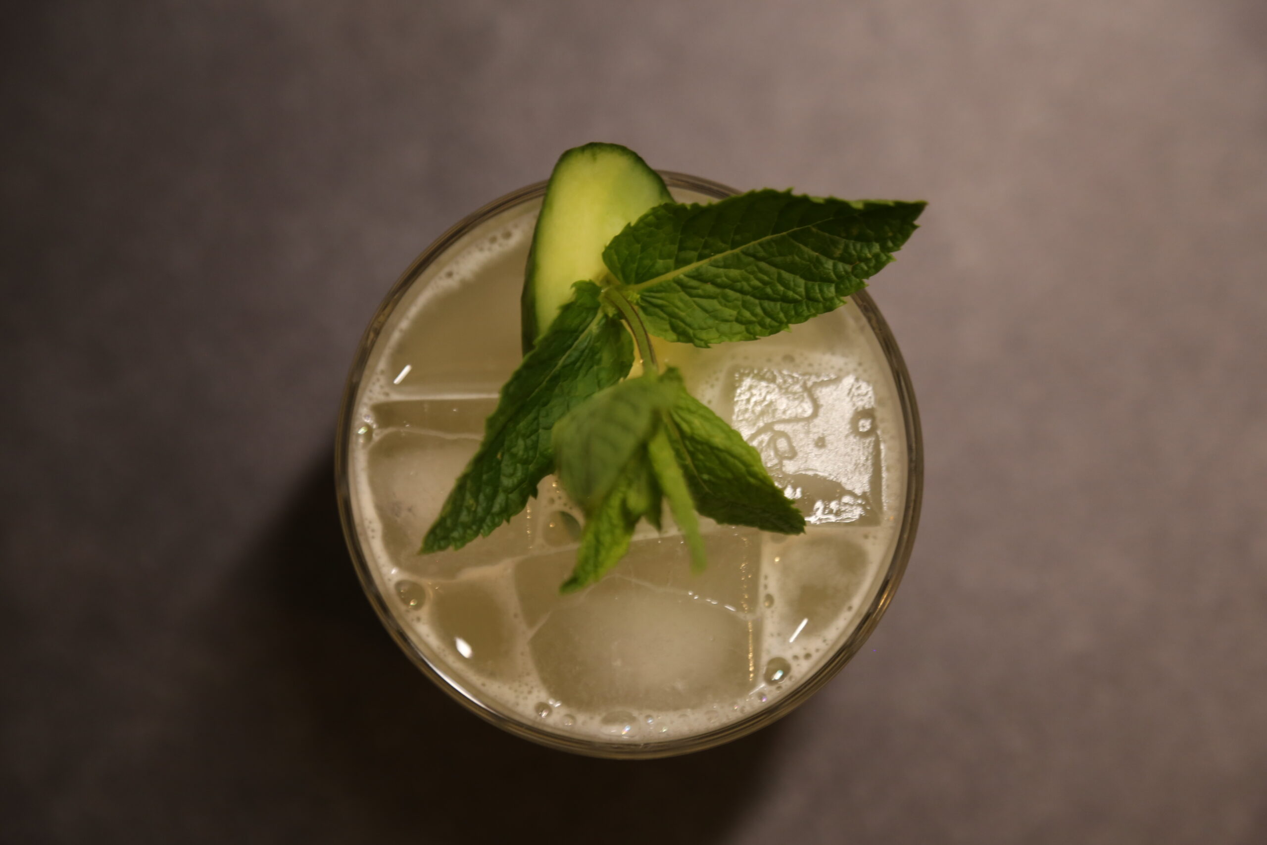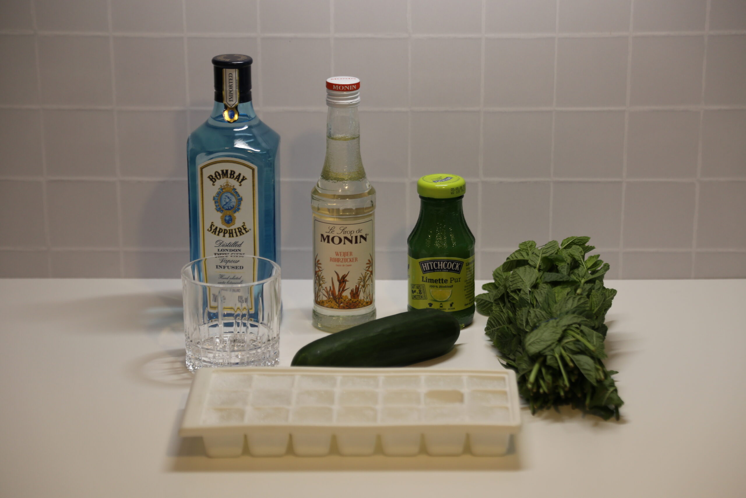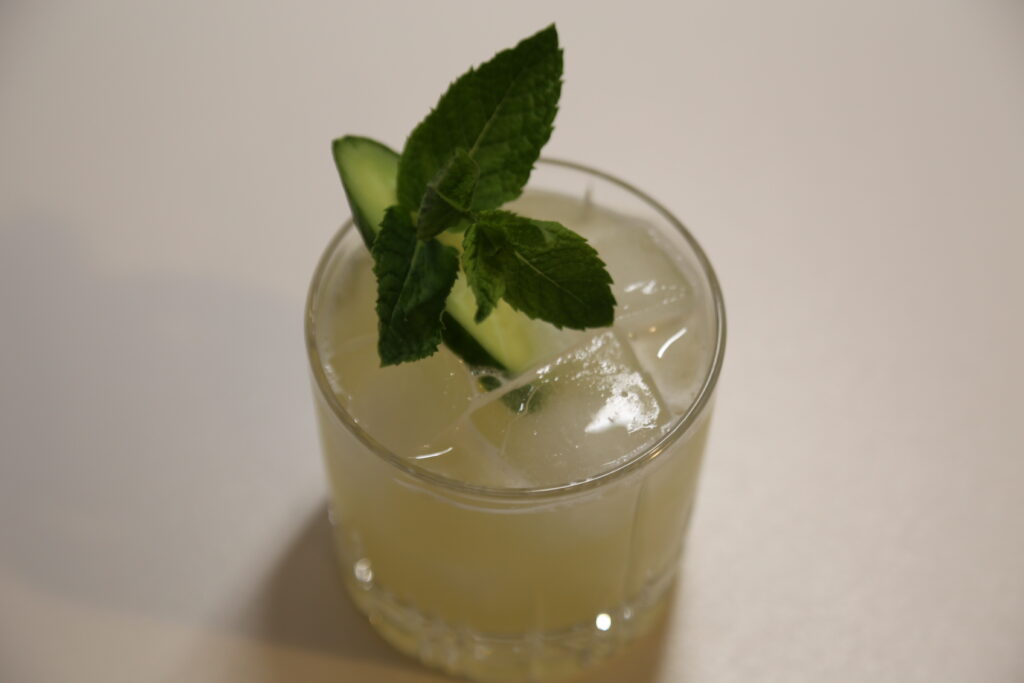 3 | Scheiben | Gurke | im Shaker muddlen, | dann mit |
